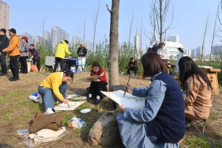 活动现场,不同门类的文艺工作者各展所长。诗词学会的会员围绕雁南红枫即兴创作诗词,将现场景致与“霜叶红于二月花”的经典名句巧妙融合,诞生出多首鲜活诗作;美术家们选取园区内枫景绝佳的角落搭建写生点,以细腻笔触勾勒枫景与公园生态;摄影家们用镜头捕捉叶片特写、光影变化及市民与秋景互动的鲜活瞬间。