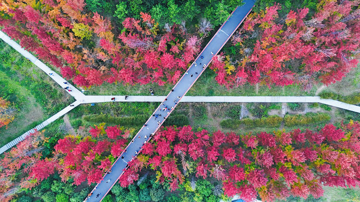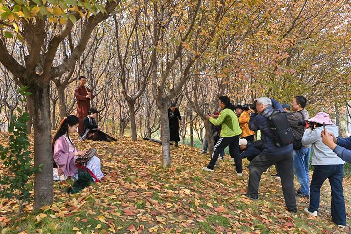 雁塔摄影家协会会员陆龙生将镜头对准一片红枫叶片按下快门。他的相机里,已有数十张不同角度的枫景,还有一家三口在枫林旁野餐的温情画面。“不只是拍枫,还要拍人和枫的互动,这样才是幸福雁塔的样子。”他边拍边说。